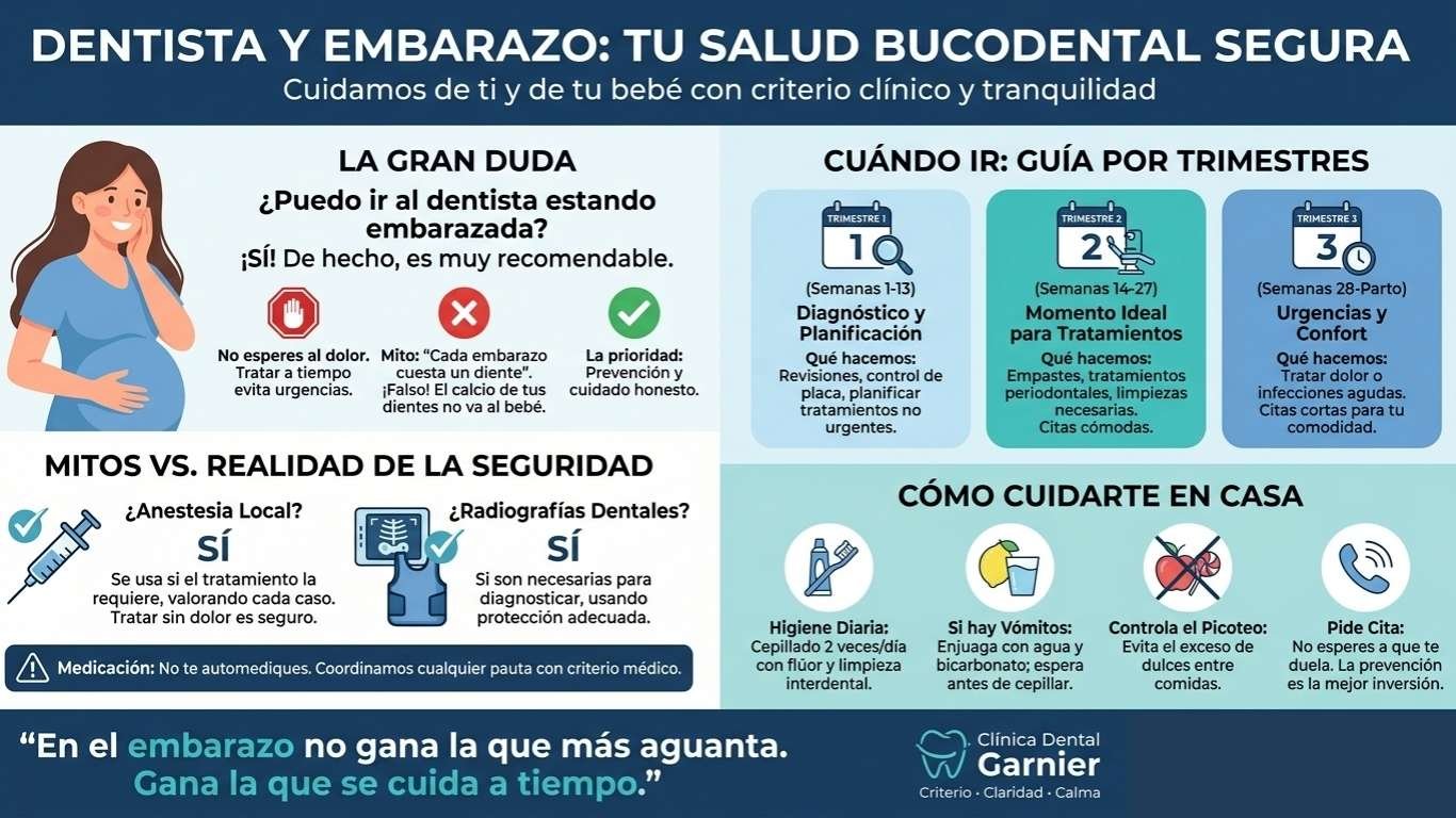 Aquí va la parte honesta que muchas veces no se explica bien: no todo tratamiento se hace en cualquier momento ni de cualquier manera. Hay procedimientos que preferimos planificar con calma y otros que no conviene retrasar. Esa es precisamente la diferencia entre improvisar y cuidar de verdad. No se trata de hacer por hacer. Se trata de valorar tu caso, tu momento del embarazo y lo que necesitas ahora mismo. Ese enfoque encaja con una odontología seria, tranquila y sin presiones, justo la línea que Garnier quiere transmitir a sus pacientes.